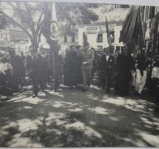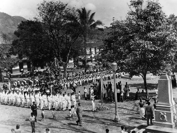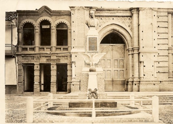 Nota: Las fotografías que aparecen a continuación son "de contexto". Entre ellas se puede observar el monumento a Enrique Olaya Herrera, la plaza en cuyo costado se observa el pedestal al que le arrancaron el busto del político liberal. Las demás son el busto del Indio Uribe, recién inaugurado en 1940; aspecto de la plaza en un día de mercado, mediados década del 40; congregaciones populares por la llegada del gobernador militar; entierro del cura Efrén Montoya.